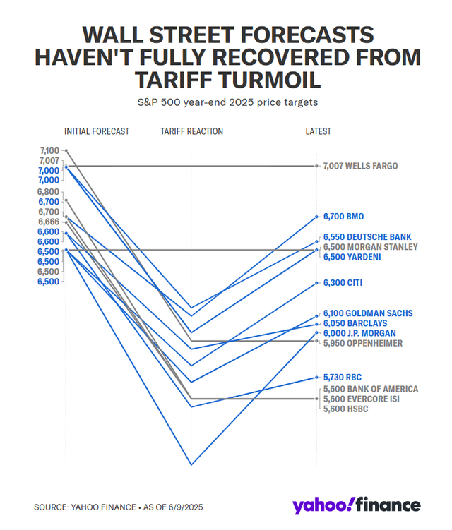 事实上,跟着市集重返历史高点,越来越多的多头正“重获自信”,并作念出了近似的预测。据统计,在4月份的市集抛售中,至少有11家华尔街公司下调了标普500指数的主张价。而自那以来,至少有8家公司提升了对该指数2025年年终收盘价的押注。